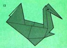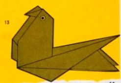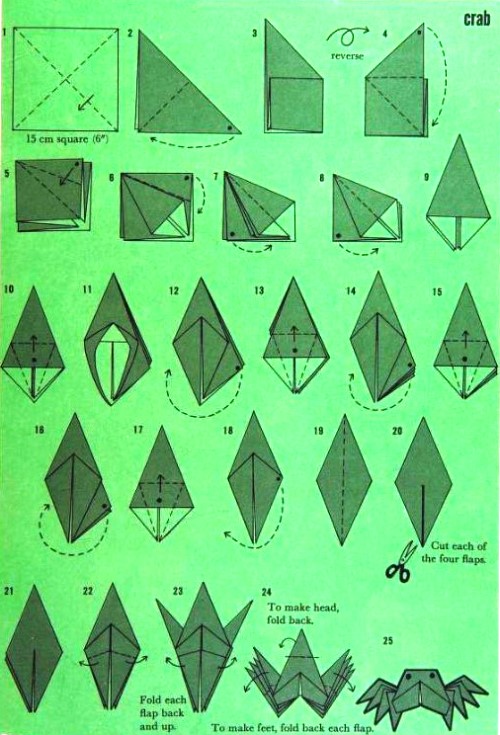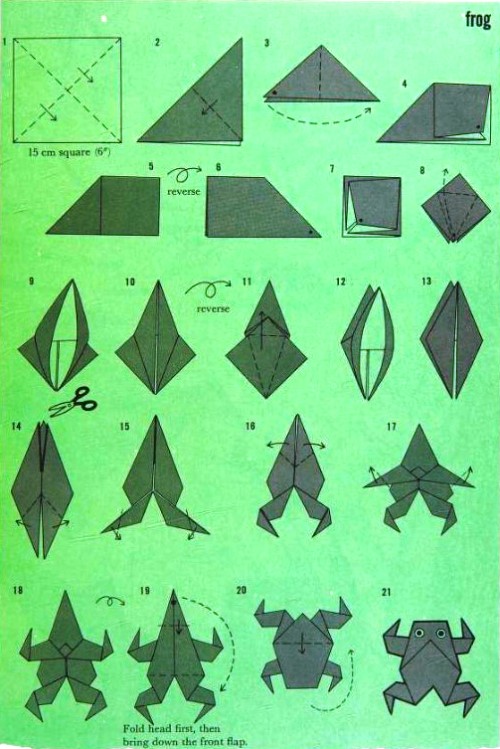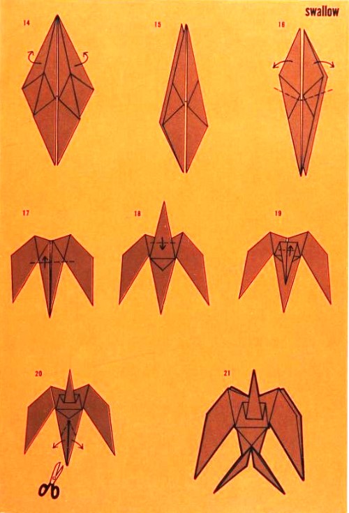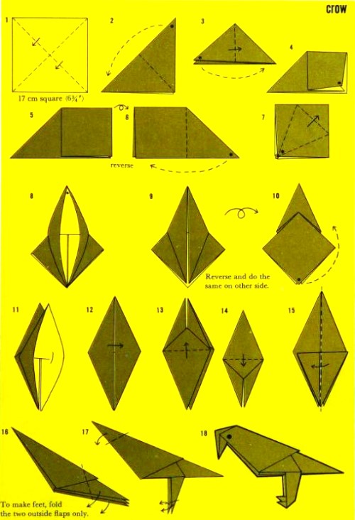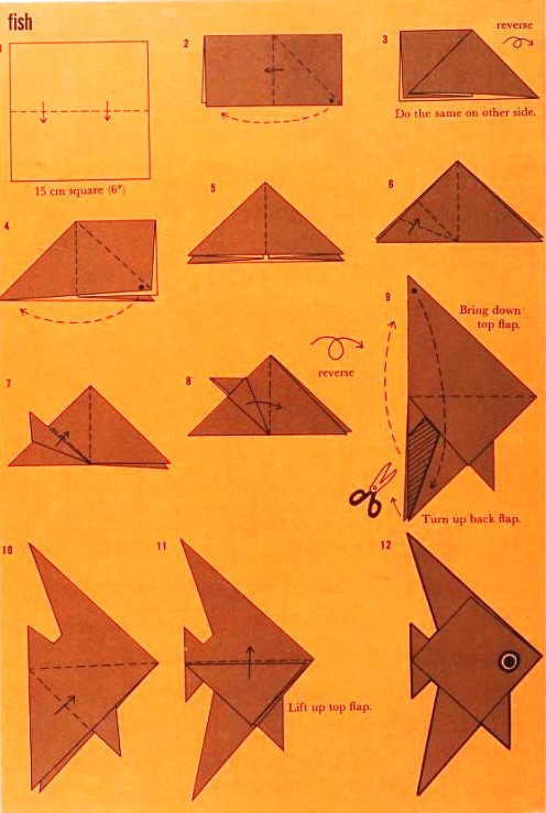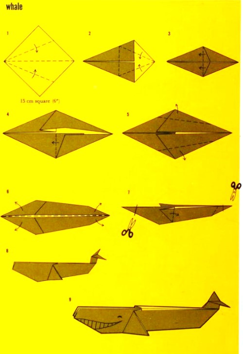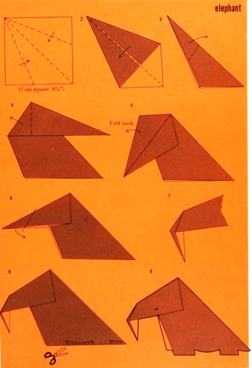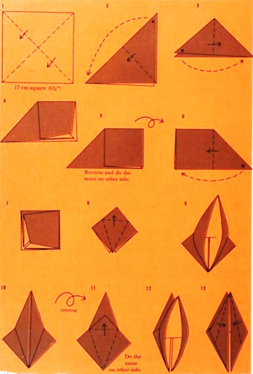 'Fold-and-Paste Origami Storybook' by Florence Sakade was published by Charles E Tuttle Company in Vermont and Tokyo in 1964. It is a book of children's stories illustrated by paperfolds. Unlike the author's previous similar work, this one does not contain folded copies of the paperfolds, but provides decorative pages onto which designs folded by the reader can be glued. A pack of suitable paper was supplied with the work. I have not reproduced the stories or the decorative pages. This page only provides details of the folding instructions. Many of the designs are cut and/or decorated (with eyes). A full copy of the work can be accessed online here. **********