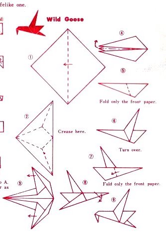 ********** 1964 A design for a 'Wild Goose' folded from a square appears in 'Happy Origami: Tortoise book' by Tatsuo Miyawaki, which was published by Biken-Sha in Japan in 1964.