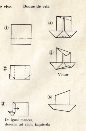 ********** 1960 This simple boat appears as 'Buque de vela' in (the Spanish version of) 'Happy Origami: Swallow Book' by Tatsuo Miyawaki, which was published by Biken-Sha in 1960.
