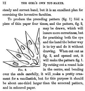 made as a craft activity in British primary schools. The cutting of patterns in complex symmetric patterns of this kind has sometimes been included in conjuring performances. There is a separate page about the history of the specific Paper Doily design and magical effect known as The Ship's Wheel. There is a separate page about Paper Snowflakes (ie a similar class of design, but possessing only sixfold symmetry). ********** 1860 As far as I know the earliest known instruction for making a Paper Doily appear under the title 'Paper Cuttings' in 'The Girl's Own Toymaker' by Ebenezer Landells and Alice Landells was published in 1860 by Griffin and Farran in London and Shephard, Clark and Brown in Boston.