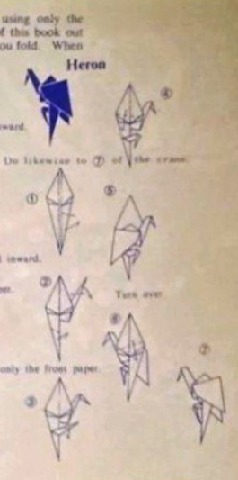 ********** 1965 As 'Heron' in 'Origami Fun Book: Crane Book' by Tatsuo Miyawaki, which was published by Shikoku Hoiku Co Ltd in Matsuyama, Japan in 1965.