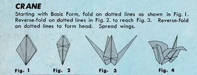 ********** 1927 A drawing of what is probably supposed to be a Paper Crane appears in an illustration by Takei Takeo in a 1927 issue of the children's magazine 'Kodomo No Kuni' (The Land of Children). ********** Diagrams for the design also appear: 1931 In 'Origami (Part 1)' by Isao Honda, which was published in 1931. ********** 1935 'Origami Moyo, Book One', by Kawarazaki Kodo, which was published by Unsodo in Japan in 1935, contained a print showing Paper Cranes. ********** 1944 In 'Origami Shuko' by Isao Honda, which was published in 1944. ********** 1951 As 'Tsuru' in 'Origami to Kirinuki' by Saburo Ueda, which was published by Kokkado in Tokyo, most probably in 1951. ********** 1957 As 'A Crane' in 'Origami: Japanese Paper Folding', which was published in English by Toto Shuppan Company Ltd in Tokyo in 1957. ********** In 'Origami: Book One' by Florence Sakade, which was published by the Charles E Tuttle Company in Rutland, Vermont and Tokyo in 1957. The text includes instructions as to how it is to be inflated and some interesting contemporary information about the socia and religious context of the design: ********** 1959 In 'How to Make Origami' by Isao Honda, which was published by Toto Shuppan Co. Ltd in Japan. by McDowell Obolensky of New York in the USA and by Museum Press Ltd of London in England, in 1959. ********** As 'A Crane' in 'Origami: Japanese Paper Folding - Sakura Book' by Isao Honda, which was published in English by The Asahi Origami Club in 1959. ********** 1959 As 'A Crane' in 'Origami: Japanese Paperfolding: Fuji Book' by Isao Honda, which was published in English by The Asahi Origami Club in 1959.