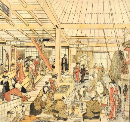 According to Michele C Cone in an article on Artnet entitled 'Prelude to Desire (www.artnet.com/Magazine/features/cone/cone1-28-05.asp): 'In a six panel screen entiled Courtesans Exposed to Public Viewing, Katsukawa Sun'ei marvelously illustrates those aspects of geisha life. One feels the quiet and expectant atmosphere that reigns inside the green tea house, the geishas' place of work. The wall of windows from which the clients will inspect the young women and make their choice is at the moment bare and black, in contrast to the crowded interior and its seated inhabitants rivaling in grace and beauty. The colors of the kimonos, each featuring a different printed pattern, pick up the black of the windows, the red of the floor and the ochre of the walls. By a subtle individualization of gestures and facial traits, the artist suggests something of the loneliness, isolation and fight against boredom that must have reigned during those moments of idle wait.' ********** 1793 A lady holding a Paper Crane (and another holding a Paper Boat) appears in the central panel of this triptych by Chôbunsai Eishi (17561829) titled 'Women in a Phoenix Boat at New Year' which can be dated to c1793. Information from Jaume Coll Guerrero. ********** 1797 The Senbazuru Orikata, a book of paperfolding designs for connected cranes, was published in Kyoto in 1797. Senbazuru means 1000 cranes. Orikata is an older word that means the same as origami. The number 1000 in the title is used symbolically, since in Japan, cranes are associated with good fortune and long life. Despite the title, if you folded all the designs in the book you would only have folded about 250 cranes in all. The designs are created by cutting slits in large squares to divide them into several, or many, small, but not completely separate, smaller squares and then folding each of these into a paper crane. The cranes remain connected by beak, legs, or wingtip when the design is complete. ********** 1780s This print by Torii Kiyonaga shows the interior of the Courtesans' House Choshiya in Shin-Yoshiwara and can be dated to the 1780s. (Information from 'Ukiyo-e the art of the Japanese Print' by Frederick Harris, published 2010.) At the bottom left of the picture a man tends a brazier. To the right of the brazier is part of a tray of Paper Cranes. I have no idea why a tray of Paper cranes would be found in a Courtesans' House. ********** 1803 This print by Utagawa Toyokuni I (1769-1825), which shows a samurai wearing a kimono patterned with Paper Cranes, is from the picture book 'Yakusha konotegashiwa' which was published in 1803. ********** 1804 In this print by Kitagawa Utamaro (1753-1806) from Volume 1 of the picture book 'Seiro ehon nenju gyoji', which was published in 1804, the boy in the bottom left corner is wearing an outer robe patterned with Paper Cranes. ********** In this print from Volume 2 of the same book the woman at the left is also wearing an outer robe patterned with Paper Cranes ********** A second print in the same volume shows the kneeling woman in the centre, who is serving drinks, wearing a similar outer robe. ********** 1806 This print by Utagawa Toyokuni I, which is said to date from 1806 (the 12th month),from the series Ukiyo shichifukujin (Seven Gods of Good Fortune of the Floating World), shows a man (a god?) holding a Paper Crane by the tail. ********** 1808 This print showing a woman wearing an outer robe patterned with Paper Cranes is from Volume 1 of the picture book 'Edo shokunin uta-awase' which was published in 1808. Artist unknown. ********** 1809 This print by Eisai Hokutai from Volume 1 of 'Tokaeri hana' shows a lady wearing a kimono patterned with Paper Cranes. ********** 1813 In this print by Jippensha Ikku (1766-1831), which is from Volume 2 of the picture book 'Edo meisho ehon', published in 1813, two of the men are wearing robes patterned with Paper Cranes. ********** 1815 This print by Katsushika Hokusai, which can be dated to 1815, shows a woman preparing to inflate a Paper Crane. Source: 'Oru Kokoro', the catalogue of an exhibition on paperfolding history held in Tatsuno City History and Culture Museum in 1999.
