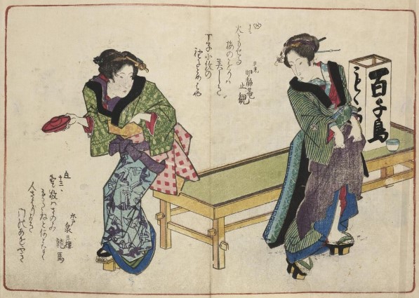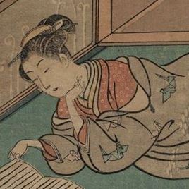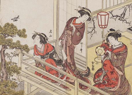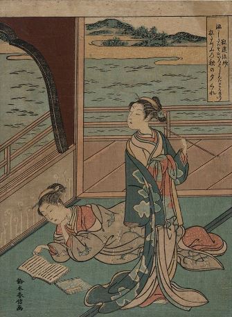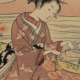 Note, however, that according to Origami in Ukiyo-e prints this print is 'Parody of the Story of the Chrysanthemum' by Mitate Kiku Jido, 1765. ********** 1772/3 This print entitled 'Orizuru o tsukuru shojo' (Children folding a paper crane) by Koryusai Isoda (active 1764 -1788) is in the collection of the Library of Congress in Washington, USA. According to https://www.loc.gov/pictures/item/2008660852/ it can be dated to 1772/3. ********** 1776 This print is Volume 1 of 'Seiro bijin awase sugata kagami' by Katsukawa Shunsho (1726 -1792) and Kitao Shigemasa (1739-1820) which was published in 1776. The woman on the left is wearing a Paper Crane patterned outer robe. ********** 1775/1785 According to the British Museum (https://www.bmimages.com/preview.asp?image=00034787001) 'This rare six-fold screen can be firmly attributed to Utagawa Toyoharu (1735-1814) and is one of the most important surviving Ukiyo-e paintings of its period. A group of high-ranking courtesans are seated on the red carpet in the centre, surrounded by their apprentices ... arranged in pairs with matching kimonos around the walls. The women are in the harimise, the latticed display room of a brothel in the Yoshiwara pleasure quarter, where they would sit waiting for clients. It appears to be the quiet middle period of the day, and the courtesans are amusing themselves in various ways - smoking, playing the shamisen, dressing a doll. One of the teenage apprentices has dozed off. Among the lacquered accessories depicted in the front, to the right of the smoking set, is a small box decorated with the emblem of a flying crane. According to Keisei Kei, a printed guide to courtesans published ... in 1788, this was a crest used by Komurasaki, a high-ranking courtesan in the house run by Tamaya Sansabura´. The name of the house appears, albeit playfully half-hidden, on the entrance curtain towards the centre back. The painting can be dated on the basis of its style and the fashions portrayed to the late 1770s or early 1780s.' It is just possible to see that the figure to the top left of the third panel in from the right is folding a paper crane. Another, later, more colourful, version of this screen, is attributed to Katsukawa Sun'ei (1762-1819) and held at the Musee Guimet in Paris. The two central panels of this work and the detail showing the folding of the Paper Crane are shown below.