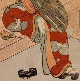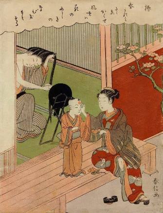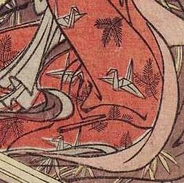 ********** 1732 In this print, which comes from 'Onna fuhzoku tama kagami' by Nishikawa Sukenobu and which was published in 1732. one of the women is holding a Paper Crane and blowing into it to inflate the body. ********** 1734 Paper Cranes are also among the designs illustrated in a woodcut from a Japanese book called 'Ranma Zushiki' published in 1734. ********** 1735 In this print from 'Nishikawa fudenoumi' by Nishikawa Sukenobu, said to date from 1735, the woman at the back is holding a Paper Crane by its tail. ********** 1742 This image is a detail from a print in Nishikawa Sukenobu's illustrated book 'Jokyo bunsho kagami', volume 1, which was published in 1742. It also shows a woman wearing a garment decorated with Paper Cranes. ********** 1748 'Ehon masukagami' by Nishikawa Sukenobu, which was published in 1748, contains a print showing the Hina Doll Festival in which one of the women is holding up a Paper Crane. ********** This image showing a kimono patterned with Paper Cranes is a detail from another print in the same book. ********** 1752 A drawing of the Paper Crane appears in a print by Nishikawa Suketada which is found in his 'Ehon hana no utage' published in 1752. ********** 1770 This print by Ippitsusai Buncho, which shows a samurai wearing a kimono patterned with Paper Cranes, is from Volume 2 of the picture book 'Ehon butai ogi' which was published in 1770. ********** This print by Suzuki Harunobu (1724 -1770), which shows a woman folding a crane with two previously completed ones on the floor, is from Volume 1 of the picture book 'Ehon seiro bijin awase' which was published in 1770. *** This print, from Volume 3 of the same work, shows a woman wearing a Paper Crane patterned outer robe. ********** 1765 - 1770 These four prints by Suzuki Harunobu (1725-1770) show kimonos decorated with paper cranes. (Information from Juan Gimeno) The full-colour technique used to make these prints was first used in 1765 and these prints must therefore date to between then and his death in 1770.