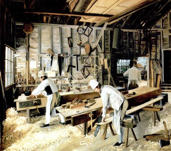 information that should be added. Thank you. There is a separate page for the Printer's Hat (which is developed in a different way). There seem to have been two different ways of making Workman's Hats, either from a square or an oblong. If made from an oblong, the hat can be sized to fit a particular head by folding down the top of the initial waterbomb base like area so that the crease is one quarter of the required circumference of the brim. If made from a square the circumference of the head must first be measured and the square cut to the necessary size. The sides of both types of hat are locked together by rolling the brim upwards, sometimes several times. The amount the brim is rolled up affects the apparent proportions of the design. Excess paper seems to have been commonly cut away before the brim was rolled up (which would reduce the paper to a square). It is possible that all Workman's Hats hats were originally folded from oblongs and that the square-based design was erroneously derived by unfolding an oblong-based hat from which the excess paper around the brim had previously beed removed. ********** Introduction It should not be supposed that the wearing of Workman's Hats by carpenters or other trades was ubiquitous. It is far easier to find illustrations of workmen wearing hats of other kinds, or not wearing hats at all, than it is to find illustrations of workmen wearing paper hats. In addition many illustrations show one worker wearing a Workman's Hat and others wearing some different type of headgear within a single workshop. I have only found one drawing of a female worker wearing a Workman's Hat (see entry for 1858). The best source of information on Workman's Hats that I know of (apart from this page) is 'Occupational Costume in England: From the Eleventh Century to 1914' by Phillis Cunnington and Catherine Lucas (available here), which was published by Barnes and Noble Inc in New York in 1967. Page 87 gives a list of trades known to have worn Workman's Hats and the date that this can be evidenced from, which is reproduced below. Unfortunately most of the evidence, especially the early evidence, 'taken from contemporary illustrations', on which this list is based, is not included in the book. The book also contains reference to an advert which state 'No Paper Hats sold'. Although this is indeed curious, there does not seem to me to be any necessity to assume that the paper hats sold elsewhere were Workman's Hats. Other kinds of hats made from paper, of a much more decorative kind, were common at this period. ********** Chronology c1800 An oil painting by John Hill, dated around 1800, in the collection of the Tate Gallery in London, shows two carpenters in a workshop wearing paper hats. The picture is titled Interior of the Carpenter's Shop at Forty Hill Enfield'. A label that was once pasted to the back of the original canvas (but is now separately preserved) states that it was 'painted by John Hill of Forty Hill about 1800 his first finished picture'. However it was not exhibited until 1813.