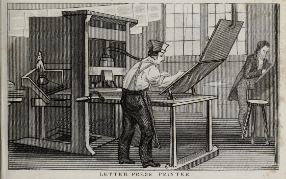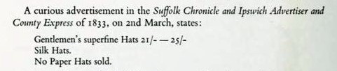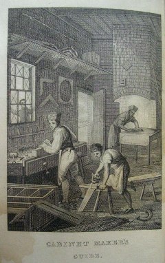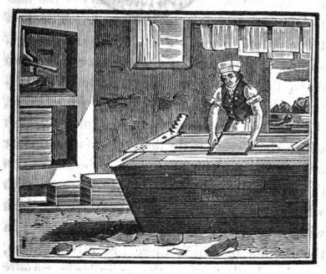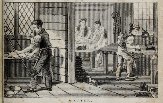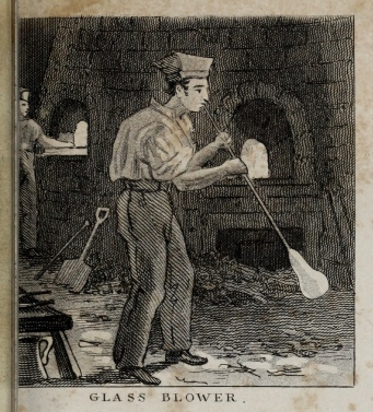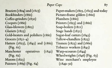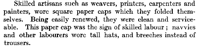 ********** 1842 There are several illustrations of tradesmen wearing Workman's Hats in the 'Complete Book of Trades' by Whittock, Bennett and Badcock et al, which was published by Thomas Tegg in London in 1842. The trades in question are carpenter, glass-blower, hatter, letter-press printer and paper-maker.