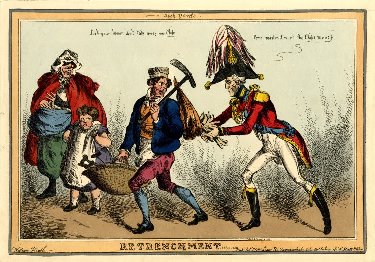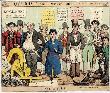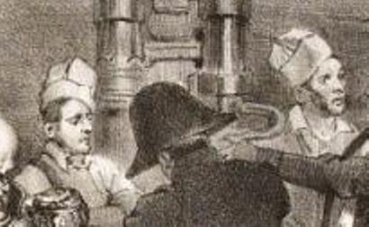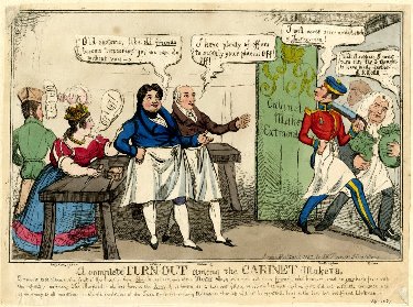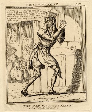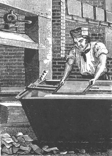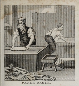 ********** 1810 This painting, said to be from 1810, is of Marchant Warrell, who was the first 'paper-machine man' (ie a man in charge of a paper-making machine) and worked for the Fourdrinier brothers at Two Waters Mill in Derbyshire, wearing a Workman's Hat. The original painting is now said to be in Australia. Source: Hertfordshire Genealogy: Warrell, Hemel Hempstead, early 19th century. My thanks to Michel Grand for sharing this information. ********** 1816 In 'The Workbench Book' by Scott Landis, published by the Taunton Press in 1987, there is an illustration which reproduces an 1816 painting titled 'English Joiners at Work' by George Forster (which is held in a private collection). The hats shown in this painting are different from the normal style of Workman's Hats found in contemporary illustrations (although they seem to have been made in an essentially similar way). ********** 1819 Part 5 of 'The Sketch Book of Geoffrey Crayon, Gent' by Washington Irving, which was published by C S Van Winkle in New York in 1819, contained the following paragraph mentioning a smith wearing a 'brown paper cap'. ********** 1820 This woodprint of a papermaker is taken from 'Artificiana A Guide to the Principal Trades' which was published by Oliver and Boyd in Edinburgh in 1820. There are other woodprints in the book showing square-shaped hats worn by a hat maker, a cabinet maker and a gold beater which may quite possibly also be Workman's Hats. ********** 1821 This somewhat similar image of a papermaker wearing a Workman's Hat is said to be from an English engraving printed for F.C. and J. Rivington in 1821. Information from Michel Grand. ********** These four satirical prints from the British Museum all show workmen wearing folded paper hats. Information from Juan Gimeno / Jaume Coll Guerrero. From April 1827