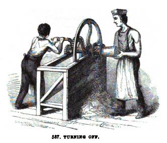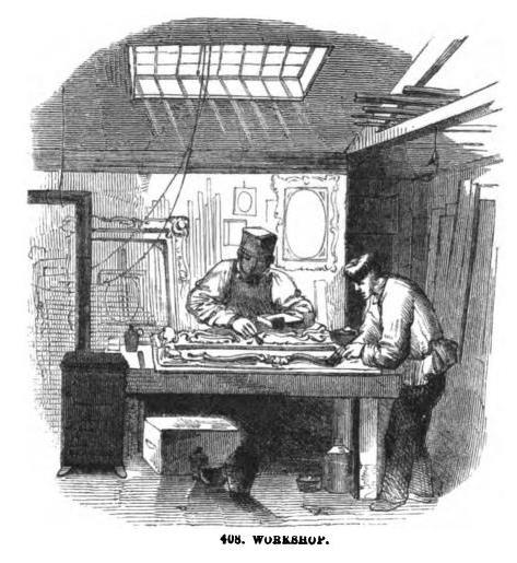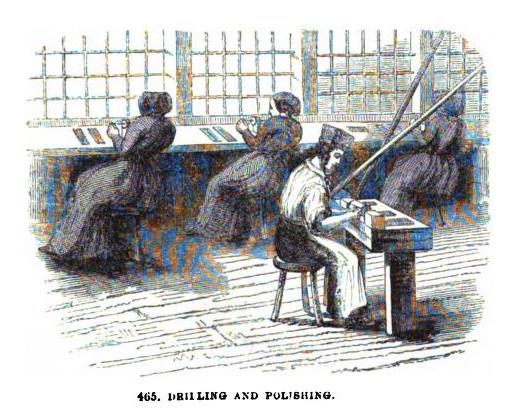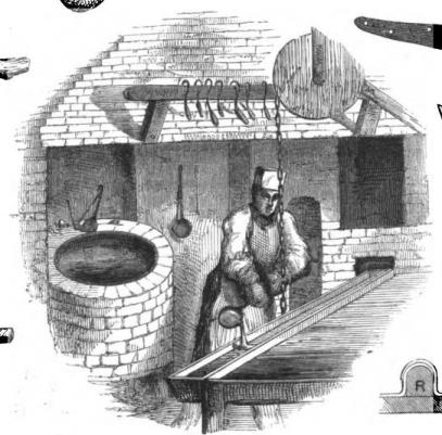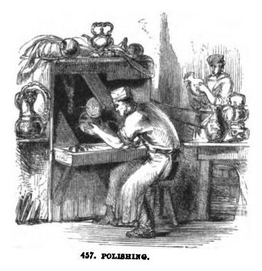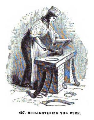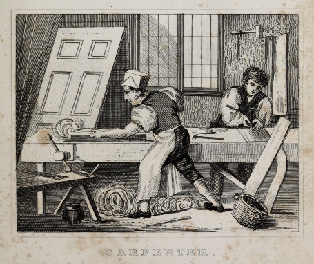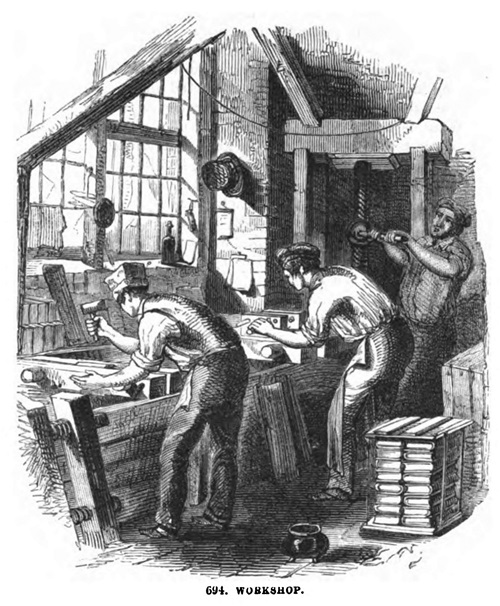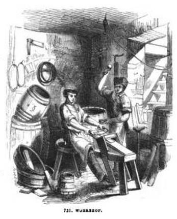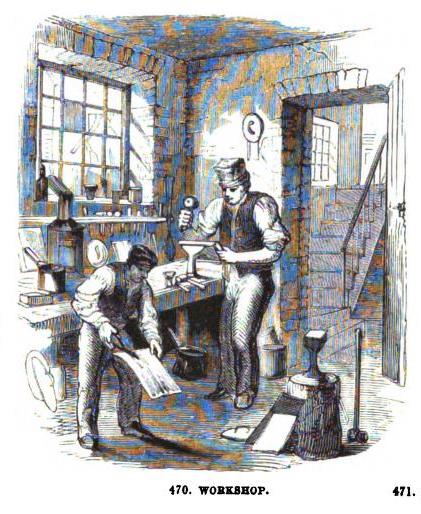 ********** 1853 This cartoon from the October 22nd 1853 issue of the British satirical magazine 'Punch' shows a carpenter (note the saw on his shoulder) wearing a Workman's Hat. (Information from Juan Gimeno) ********** 1856 This picture of a carpenter wearing a Workman's Hat is from the magazine 'British Workman' vol 1, nº 12 of 1856. Information from Juan Gimeno. ********** 1858 There are several illustrations of tradesmen wearing Workman's Hats in 'Illustrations of Useful Arts, Manufactures and Trades' by Charles Tomlinson, which was published by the Society for the Promotion of Christian Knowledge in 1858. My thanks to Michel Grand for drawing this book to my attention. The Bookbinder *** Carpenter *** Cooper *** Goldbeater *** Lace Maker *** Needle Maker (Note