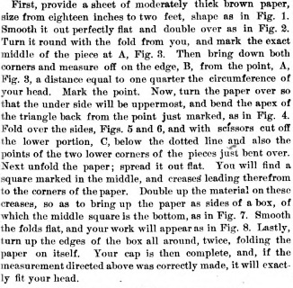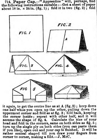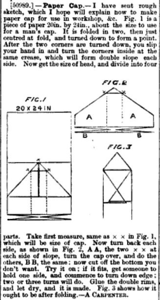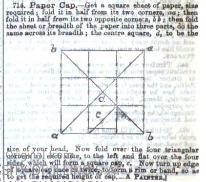 ********** 1872 These 1872 illustrations by John Tenniel for the Lewis Carroll poem 'The Walrus and the Carpenter' show the carpenter wearing a Workman's Hat. ********** The December 1872 issue of Scientific American included these diagrams for making a protective paper cap from a sheet of brown paper. They include a way of sizing the hat to a particular head. Excess paper is cut away before the brim is rolled upwards. If the excess paper were cut off, the hat finished, then unfolded, the crease pattern would resemble that shown in the 1838 instructions above.