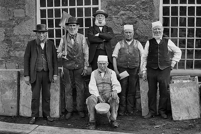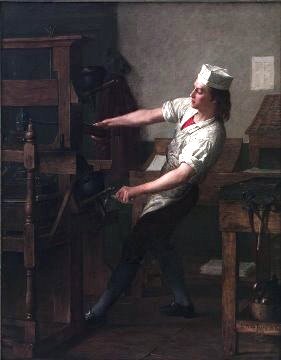 ********** 1875 This photo, taken in 1875, shows papermill workers at Withnell Fold wearing Workmen's Hats. Information from Mike Malley. ********** 1876 This painting from 1876 by Enoch Wood Perry titled 'Young Franklin at the Press' shows a young Benjamin Franklin wearing a workman's paper hat. This may well be a historical anachronism.