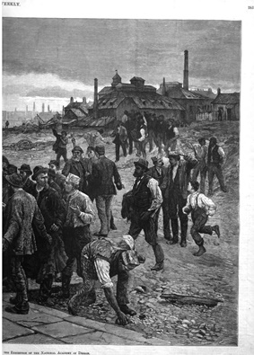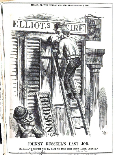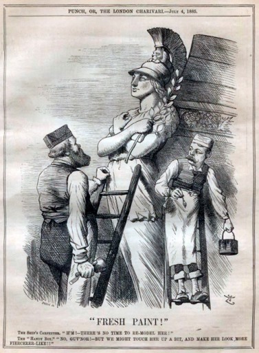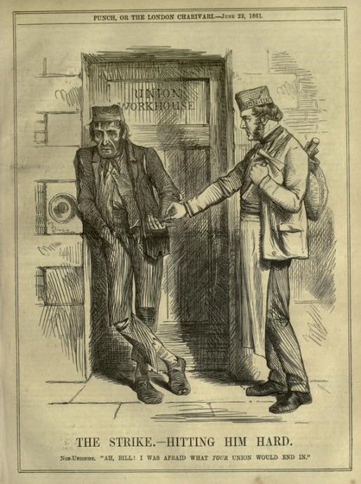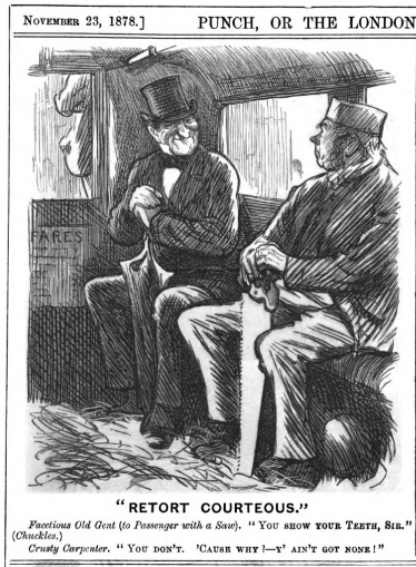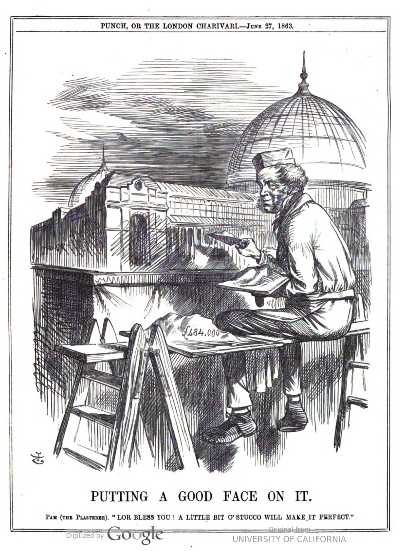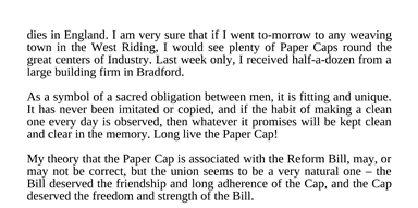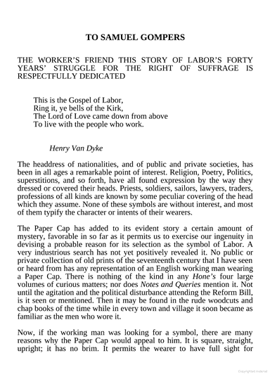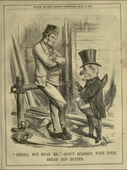 ********** 1859 In the opening paragraph of her novel 'Adam Bede', first published in 1859 but set in 1799, George Eliot wrote, ' In his tall stawaltness, Adam Bede was a saxon, and justified his name; but the jet-black hair, made more noticeable by its contrast with the light paper cap, and the keen glance of the dark eyes ...' and in the next paragraph describes Adam's brother Seth, stating that 'He has thrown off his paper cap, and you see that his hair is not thick and straight ...' ********** 1861 'Punch' magazine of April 6th 1861 contained a cartoon showing a workman wearing a paper hat being given rather reactionary advice by Mr Punch. *** A second similarly themed cartoon appeared in the issue of 'Punch' for June 22nd 1861. ********** 1863 This cartoon by John Tenniel appeared in Punch of June 27, 1863. ********** This cartoon by John Tenniel appeared in Punch of September 5th 1863. ********** 1867 This illustration showing printer's wearing Workman's Hats is stated to be from the Graphic in 1867. ********** 1869 Volume 1of 'Cassell's Household Guide', first published in this year, contains mention of a square paper cap as one of the identifying features of the appearance of a Workman in a description of how to play Acted Charades.
