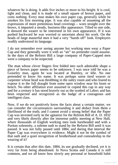 ********** 1914 Sam Loyd's 'Cyclopedia of Puzzles', which was published by The Lamb Publishing Company in New York in 1914 contains two illustrations of carpenter's wearing Workman's Hats. Information from Michel Grand. ********** 1918 The introduction to the novel 'The Paper Cap' by Amelia Barr, which was published in 1918, associates the Workman's Hat with the Reform Bill of 1832. I cannot, however, find any other evidence to support this view. ********** 1926 In his book 'The Days of Dickens', published in 1926, the author, Arthur L Hayward, writes: ********** 1939 Instructions for folding a Workman's Hat from a suitably sized square appeared in The (Montreal) Gazette of 31st March 1939. ********** |