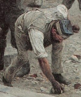 ********** 1878 A cartoon of a carpenter wearing a paper hat appeared in the magazine Punch of November 23rd 1878. (Information from Juan Gimeno) ********** The issue of 'The Illustrated Carpenter and Builder' for January 11, 1878 (p 28) contains instructions for making a Workman's Hat. Information from Matthew Demakos. In this verson the excess paper isfolded into the brim. Although the instructions say 'Calculate the size of your head and foldin the corners ...' no method of achieving the desired size is given. ********** The issue of 'The Illustrated Carpenter and Builder' for February 1, 1878 (p74) also contains instructions for making a Workman's Hat. Information from Matthew Demakos. This versionbegins from a square and uses division into thirds to establish the size of the brim. ********** 1881 This photo, taken in 1881, shows papermill workers at Tuckenhay wearing Workmen's Hats. Information from Mike Malley. ********** 1883 The issue of 'English Mechanic and World of Science' for August 24, 1883 (p581) also contains instructions for making a Workman's Hat. Information from Matthew Demakos. This version includes the method of sizing the hat to fit. The excess paper is cut away. The writer recommends getting anotherperson to help with the rolling up of the brim and that the brim should be glued in place. ********** 1885 This cartoon titled " Fresh paint!" and representing Lord Salisbury and Lord Randolph Churchill painting a statue representing Britain after the absorption by the state of the East India Company was published in 'Punch' on 4th July 1885. (Information from Juan Gimeno) ********** 1886 The German born Robert Koehler, who spent time in America, painted this famous work, 'The Strike', in Munich in 1886, Although painted in Germany the picture is set in America. It includes three figures wearing Workman's Hats, one of whom is bending down to pick up a rock, presumably to throw at the top-hatted figure on the left. The hat this bent-over figure is wearing appears to be made from paper which is blue on one surface and white on the other. I do not know if there is any particular significance to this. The work was heavily restored in 1971 and is now in the Deutsches Historisches Museum in Berlin. I learned of the existence of this picture from Juan Gimeno.