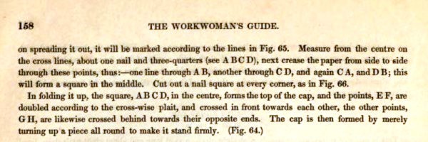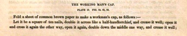 ********** From 1832 ********** 1832 Vol 2 Issue 9 of the New Sporting Magazine for January 1832 contained a story by 'A Yorkshireman' entitled 'A Day at Newmarket' which contains several mentions of a grocer, John Jorrocks, wearing a paper cap. 'A Yorkshireman' was in fact Robert Smith Surtees, and the story later appeared in his book 'Jorrock's Jaunts and Jollities', first published in 1838. ********** 1833 The frontispiece to G. A. Siddon's 1833 book 'The Cabinet Maker's Guide' also shows carpenters wearing paper hats. ********** This print by Grandville, also from 1833 shows printer's wearing what appear to be workman's hats. ********** 1838 The earliest diagrams / folding instructions explaining how to fold a Workman's Hat that I am aware of appear in 'The Workwoman's Guide', which was published by Simpkin, Marshall and Co in London in 1838. Details of this source were previously published in The Workwomans Guide to The Working Mans Cap, by Jeffery Stern and Edward Wakeling in 'The Carrollian: The Lewis Carroll Journal', no. 15 (Spring 2005): pp. 157. Information from Matthew Demakos. ********** 1840 Diagrams were also published in 'The School Boy's Holiday Companion' by Thomas Kentish, which was published by Relfe and Fletcher in London in 1840. Information from Matthew Demakos. In this case the design is folded from an oblong, the centre of which is folded into a waterbomb base. There is no mention in these instructions that the transverse fold can be used to size the hat. In this version the excess paper is simply rolled up inside the brim.