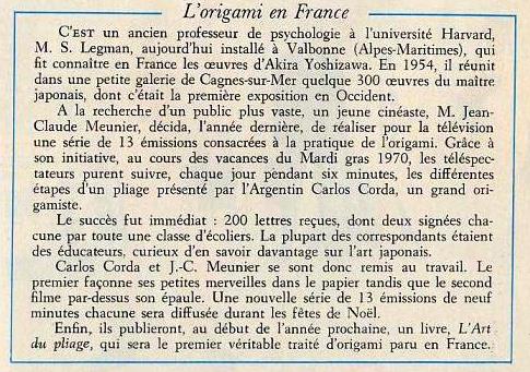 The USA version of Reader's Digest magazine of August 1970 published an article entitled 'Paper Magic of Origami' which was 'condensed' from a similar article in 'Beacon Magazine of Hawaii'. In November 1970 a similar article was published in the December 1970 issue of the French version of Reader's Digest, 'Selection du Reader's Digest'. My thanks to Juan Gimeno for sharing his copy of this article with me. In this French version the article is accompanied by additional information about origami in France in a box headed 'L'origami en France'. Note, however, that the name 'Jean-Claude Meunier' given here is an error for 'Jean-Charles Meunier'. My thanks to Michel Grand for pointing this out. Carlos Corda is better known in paperfolding circles as Adolfo Cerceda. For more details about the TV programmes mentioned here see French TV Programs made by Jean-Charles Meunier and Carlos Corda. This says, roughly translated: 'It was a former professor of psychology at Harvard University, M S Legman, now based in Valbonne (Alpes-Maritimes) who knew about the works of Akira Yoshizawa. In 1954 he brought together, in a small gallery at Cagnes-sur Mer, some 300 works by the Japanese master, which was the first exhibition in the West. In search of a wider audience, a young filmmaker, M Jean-Claude Meunier, decided last year to produce a series of 13 programs for television devoted to the practice of origami. Thanks to his initiative, during the 1970 Mardi Gras holidays, viewers were able to follow, every day for six minutes, the different stages of a folding presented by the Argentinian Carlos Corda, a great paperfolder. The success was immediate. 200 letters received, two of which were signed by a whole class of schoolchildren. Most correspondents were educators curious to know more about Japanese art. Carlos Corda and J-C Meunier got back to work. The first shapes his little wonders in the paper while the second films over his shoulder. A new series of 13 programs of nine minutes each will be broadcast during the Christmas holidays. Finally, they will publish at the beginning of next year a book, 'L'Art du Pliage', which will be the first real treatise on origami published in France.' Note that the book 'L'Art du Pliage' does not appear to have ever been published. **********